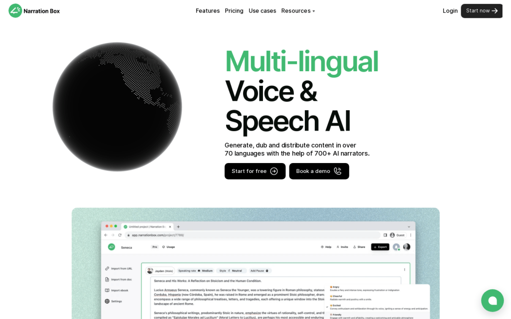 Narration Box 是一個多語言 AI 配音平臺,提供超過 70 種語言的內容生成和配音服務。它擁有 700 多位頂級 AI 配音演員,可以定製不同語言、口音、年齡和情感的聲音。Narration Box 以其高質量的語音和定製化的情感聲音,幫助使用者打破語言障礙,吸引全球觀眾。使用者可以免費註冊並選擇喜歡的配音演員,快速生成配音內容。
