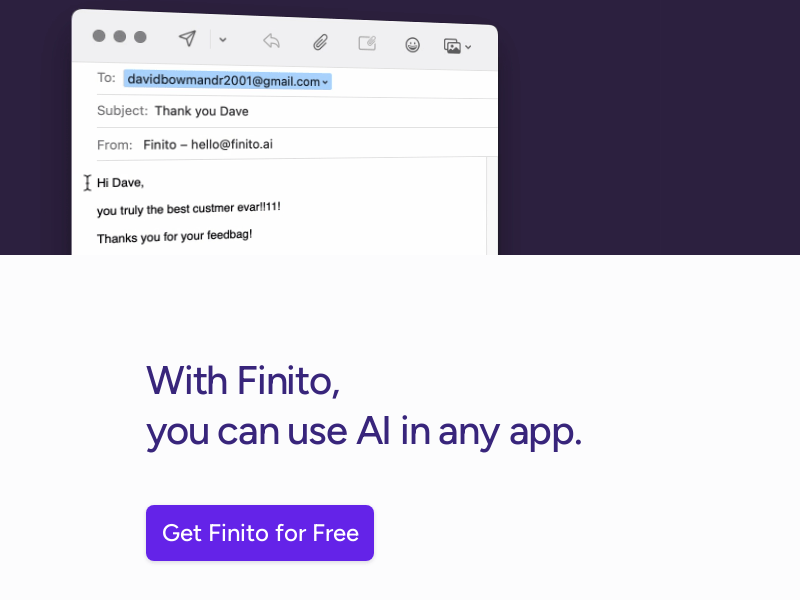 Finito AI 是一款 AI 助手產品,可以在任何應用程式或網站中使用人工智慧。只需選擇文字,按下控制鍵,讓 Finito 完成它的魔力。它使用 ChatGPT 技術,幫助您糾正語法錯誤,提高寫作水平,生成創意,進行語言翻譯,回答問題等。您可以個性化定製命令和快捷方式。Finito AI 是您隨時隨地的 AI 助手。