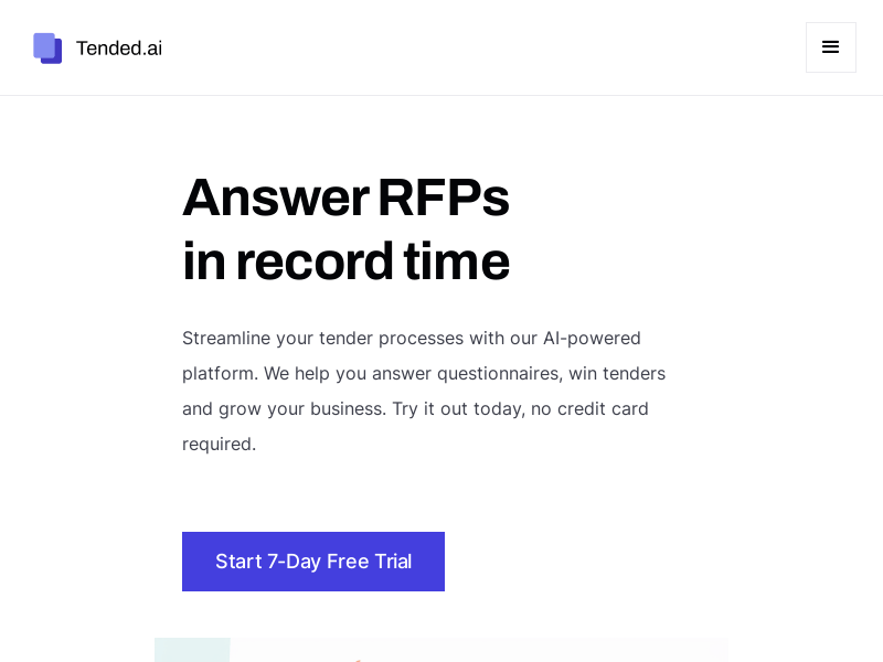 Tended.ai 是一款利用人工智慧和 ChatGPT 技術驅動的招標自動化平臺。透過先進的整合和智慧自動化,我們幫助您節省時間並贏得更多業務。透過我們的平臺,您可以回答客戶問題,填寫問卷,贏得招標並擴大業務。開始您的免費 7 天試用。