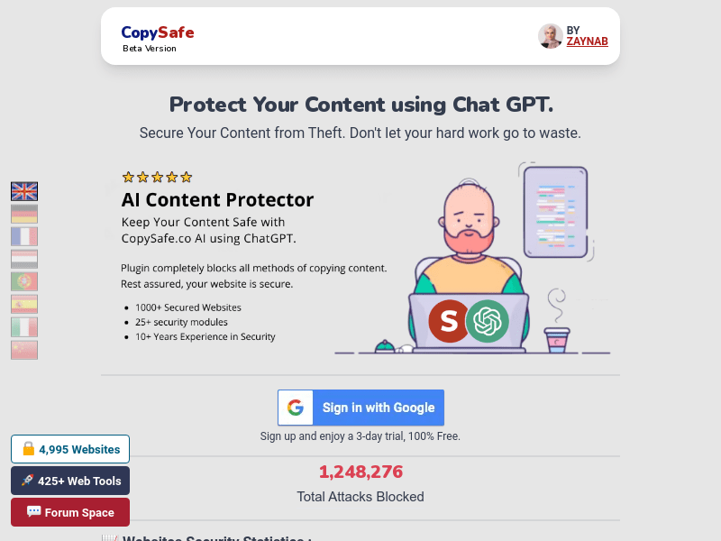 CopySafe利用Chat GPT網站提供的先進技術,保護您的內容免受剽竊和盜用。透過加密、防火牆和入侵檢測系統等高階安全措施,確保您的內容始終屬於您自己。享受風險免費的3天試用,全面訪問所有功能。以小投資獲取最大的安心和努力保護您的工作。