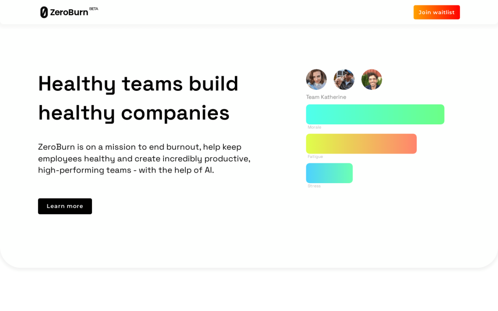 ZeroBurn致力於結束過勞現象,幫助員工保持健康狀態,建立高效的高績效團隊,藉助人工智慧技術提供支援。主要功能包括公司健康指標監測、團隊動態分析、人才發現、員工反饋收集、預測分析等。具體定價請諮詢官方網站。